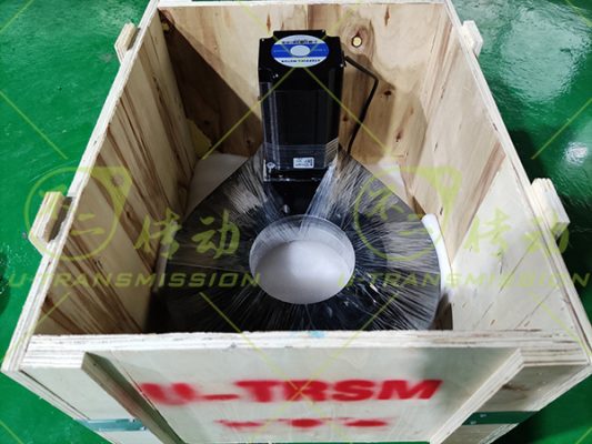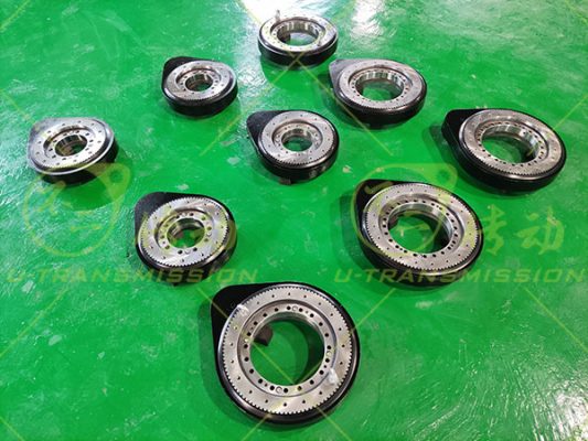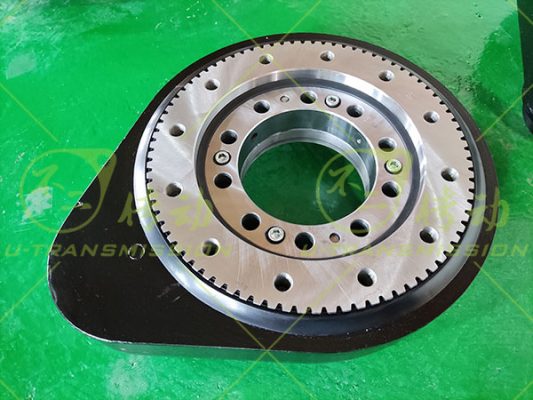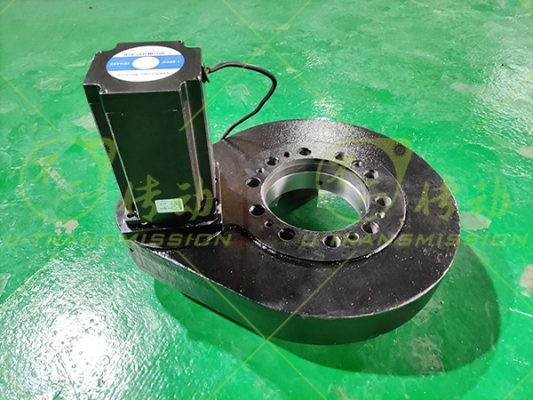 根據(jù)上述工況,采用交叉滾子回轉(zhuǎn)支承,小游隙高精度設(shè)計(jì),確保高頻震動(dòng)下回轉(zhuǎn)驅(qū)動(dòng)旋轉(zhuǎn)平穩(wěn),可靠性高?;剞D(zhuǎn)驅(qū)動(dòng)配套輸出扭矩20N.M的步進(jìn)電機(jī),在設(shè)計(jì)生產(chǎn)成品檢測(cè)過(guò)程中始終關(guān)注回轉(zhuǎn)驅(qū)動(dòng)的啟動(dòng)力矩,保證步進(jìn)電機(jī)能夠順利帶動(dòng)直齒驅(qū)動(dòng)工作。