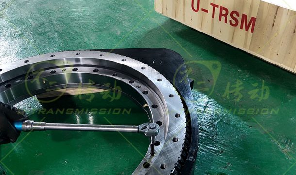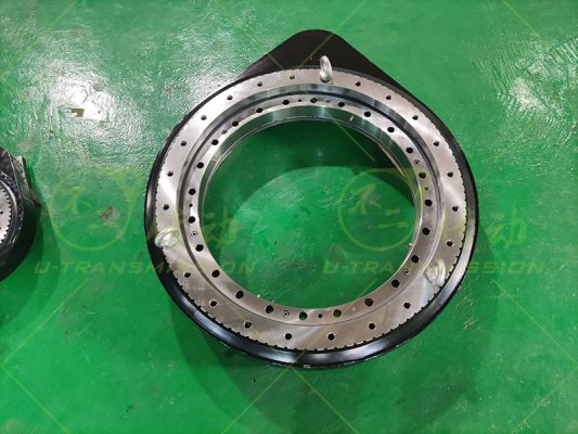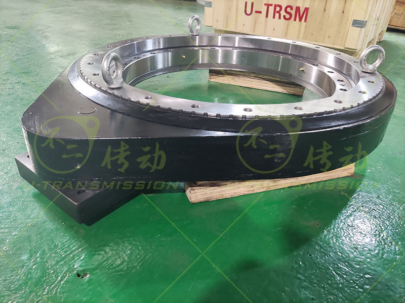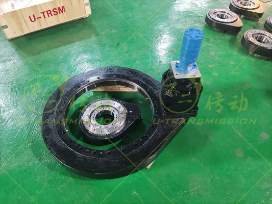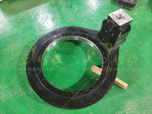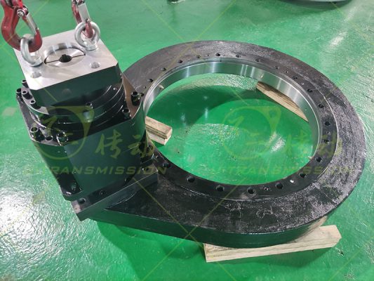 SP-III-0755 外齒大扭矩直齒回轉(zhuǎn)驅(qū)動(dòng)裝置應(yīng)用在工程機(jī)械上,客戶要求輸出扭矩大,全天候使用,需要齒輪式回轉(zhuǎn)驅(qū)動(dòng),要求有剎車功能,要求低轉(zhuǎn)速,根據(jù)客戶要求,推薦了重載系列的直齒驅(qū)動(dòng),在標(biāo)準(zhǔn)的基礎(chǔ)上進(jìn)行加高設(shè)計(jì),更適合豎直安裝使用,為客戶配套了大扭矩行星減速機(jī),帶剎車的液壓馬達(dá),方便客戶安裝使用。
