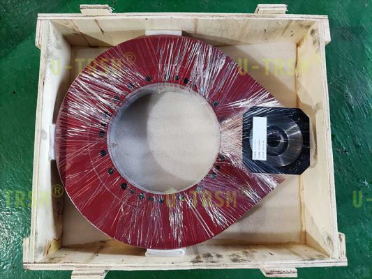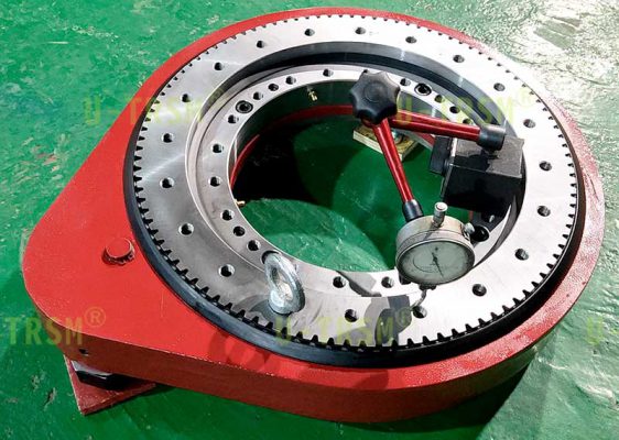 這款回轉(zhuǎn)驅(qū)動(dòng)內(nèi)部的回轉(zhuǎn)支承是負(fù)游隙,還對(duì)齒進(jìn)行磨齒加工。所謂的負(fù)游隙就是回轉(zhuǎn)支承的滾動(dòng)體和溝道過(guò)盈配合,這樣的配合可以保證內(nèi)圈和外圈之間沒(méi)有晃動(dòng),檢測(cè)表現(xiàn)為測(cè)量回轉(zhuǎn)驅(qū)動(dòng)的游隙為零,負(fù)游隙的回轉(zhuǎn)支承運(yùn)轉(zhuǎn)平穩(wěn),不會(huì)損失回轉(zhuǎn)精度。