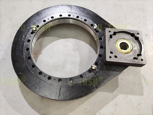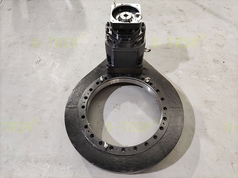 S-III-O-0655 配套三級(jí)減速機(jī)的精密磨齒回轉(zhuǎn)驅(qū)動(dòng)應(yīng)用在智能制造車(chē)間的設(shè)備上,客戶(hù)使用普通電機(jī)帶動(dòng)回轉(zhuǎn)驅(qū)動(dòng)旋轉(zhuǎn),到達(dá)指定位置后停止,要求回轉(zhuǎn)驅(qū)動(dòng)輸出轉(zhuǎn)速非常低,到達(dá)指定位置后轉(zhuǎn)臺(tái)不能有較大晃動(dòng)。